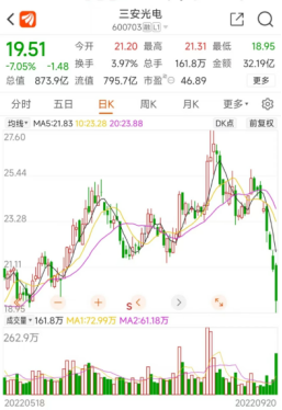 9月20日,早盘平稳运行的三安光电,午后开盘后12分钟跳水翻绿,盘中一度逼近跌停,成交量快速放大,截至收盘,股价跌7.05%,报19.51元,放量成交32.19亿元,较上一交易日增158.35%;市值较昨日缩水66.29亿元,最新总市值为873.92亿元。