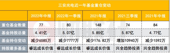 尽管有明星基金经理偏爱,但是从数据上看,今年以来,公募基金对三安光电产生了分歧。Wind数据显示,重仓持有的基金数量在2021年底达到148只高峰后,到今年两个季度以来,连续下降至80只、77只。