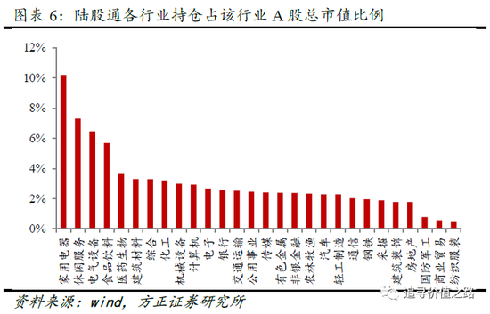 从陆股通持股市值(一级行业)占A股行业市值比来看,9月份家用电器、休闲服务、电气设备、食品饮料、医药生物行业陆股通持股市值占行业A股总市值的比例依然处于前列。截至9月30日,陆股通一级行业持股市值占行业A股市值比例排名前5的行业依次为家用电器、休闲服务、电气设备、食品饮料和医药生物,占比分别为10.2%、7.3%、6.5%、5.7%和3.6%。也就是说,外资对于上述板块仍具有很高的定价权。此外建筑材料、综合、化工等行业也是外资占比较大的行业。
