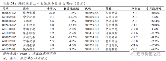 截至9月30日,当月陆股通成交活跃个股中,格力电器净买入额最高,净买入达22.0亿元,招商银行净卖出额最高,净卖出额达50.1亿元。