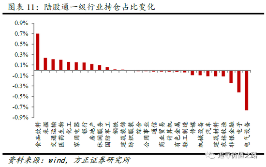 从持仓占比的变化角度看,9月份外资加仓食品饮料、采掘、交通运输、医药生物和化工等行业,减仓电气设备、电子、非银金融和农林牧渔等行业。从持仓占比的变化角度来看,外资对于食品饮料、采掘、交通运输、医药生物和化工等行业进行了加仓,分别增加0.70、0.24、0.21、0.20和0.16个百分点;对于电气设备、电子、非银金融等行业进行了减仓,分别减少0.76、0.42和0.24个百分点。