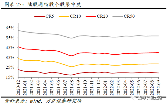 个股集中度方面,9月份陆股通持仓前五和前十集中度小幅下降,前二十和前五十集中度小幅上升。具体来看,9月份个股 CR5、CR10、CR20和CR50分别为19.4%、28.5%、40.0%和56.8%,较上月分别变化了-0.3、-0.02、0.3和0.04个百分点。