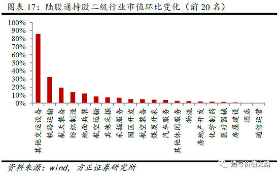 从持股市值的环比变化角度看,9月份申万二级行业中陆股通持股市值环比变化下降居多,其中其他交运设备、铁路运输和航天装备等行业持股市值增幅居前。具体看,市值环比增幅最大的前五个行业分别是其他交运设备、铁路运输、航天装备、纺织制造和地面兵装行业,环比增幅分别为86%、32%、19%、13%、12%。而园林工程、仪器仪表、贸易、光学光电子和航运等行业持股市值环比降幅居前,持股市值环比分别下降47%、34%、28%、25%和23%。
