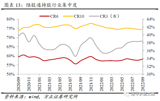 行业集中度方面,与上月相比,9月份陆股通持仓行业CR3、CR6环比上升, CR10小幅回落。具体来看,截至9月30日,陆股通持仓行业CR3、CR6和CR10分别为38.5%、58.2%和74.4%,较上月分别变化0.1%、0.6%和-0.2%。