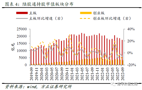 从持股市值的板块分布上看,9月陆股通持股市值在主板和创业板均小幅减少,且相较于8月而言,主板持股市值和创业板持股市值的环比增速继续下降。具体来看,截至9月30日,主板持股市值为17443亿元,环比下降6.1%;创业板持股市值3223亿元,环比下降11.5%。