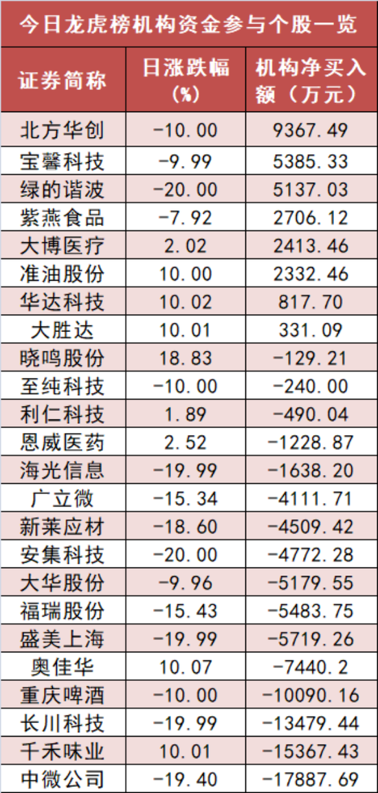 盘后龙虎榜数据显示,机构现身24股,其中北方华创等8股现机构资金净买入,中微公司等16股呈现机构资金净卖出。