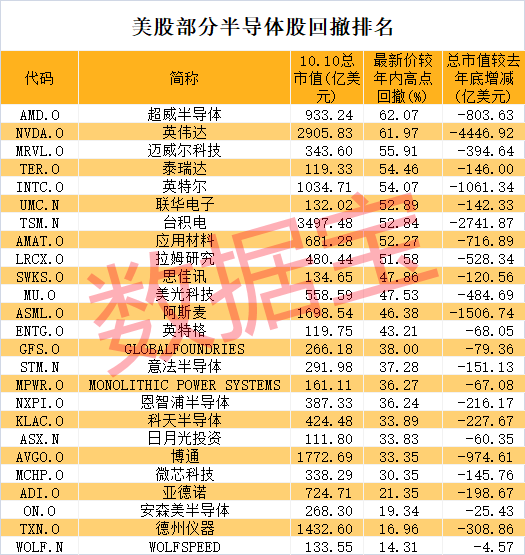 证券时报·数据宝统计,最新收盘价与年内高点相比,美股市场半导体股票平均回撤幅度达到45.84%。市值百亿美元以上的股票中,9股回撤幅度超过50%,如超威半导体、英伟达、迈威尔科技、泰瑞达、英特尔等。