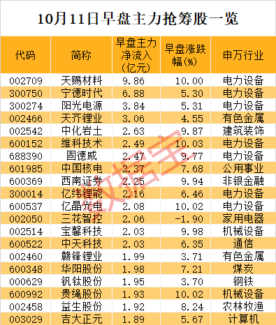 数据宝统计,电力设备、有色金属行业受到主力资金青睐,早盘主力净流入额均超10亿元。单只股票来看,34股主力净流入额超亿元;天赐材料、宁德时代、阳光电源、天齐锂业、中化岩土(维权)等净流入额居前五位。