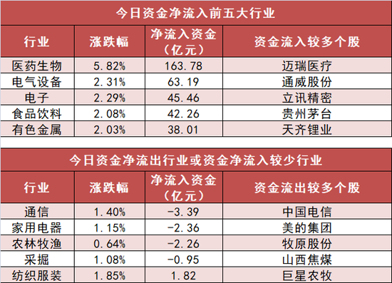申万一级行业中,24个行业实现资金净流入,其中医药生物行业净流入163.78亿元居首。