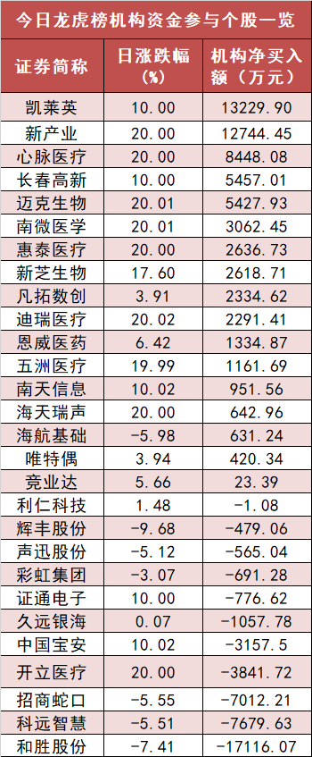 盘后龙虎榜数据显示,机构现身28股,其中凯莱英等17股现机构资金净买入,和胜股份等11股呈现机构资金净卖出。