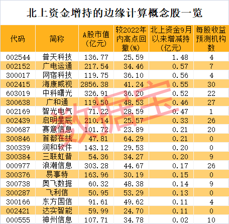 证券时报·数据宝统计,A股市场上布局边缘计算业务的公司超80家。截至10月14日收盘,收盘价与年内高点相比,概念股平均回撤37.15%。首都在线、新开普、易华录、依米康等4股回撤幅度超60%。9月以来,北上资金增持的股票有19只,按照区间成交均价粗略计算,普天科技、广电运通、网宿科技、海康威视、中科曙光等获增持超0.5亿元。