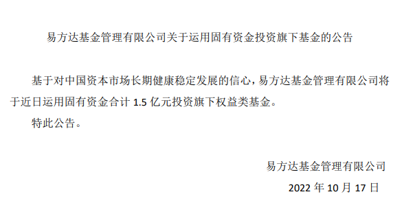 10月17日,多家公司及资管机构宣布将自购旗下产品。易方达基金公告,基于对中国资本市场长期健康稳定发展的信心,该公司将于近日运用固有资金合计1.5亿元投资旗下权益类基金。