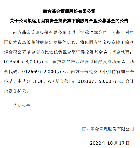 同日,南方基金表示,将以固有资金投资旗下偏股混合型公募基金,其中,3000万元投向南方比较优势A,2000万元投向南方新兴产业A,5000万元投向南方景气楚荟3个月持有(FOF)A,合计出资1亿元。
