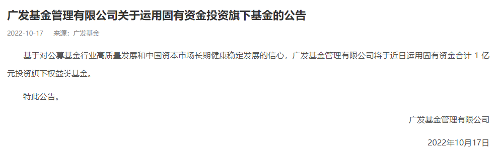 此外,汇添富基金、广发基金也分别表示,基于对中国资本市场长期健康稳定发展和公司主动投资管理能力的信心,将出资出资1亿元投资本公司旗下公募基金。