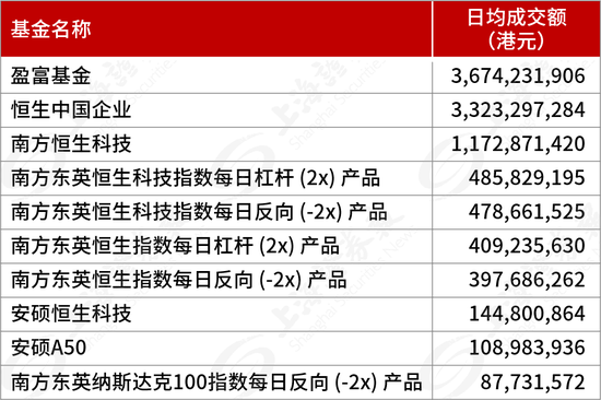 紧随其后的是公募香港子公司旗下的几只ETF,南方恒生科技日均成交额达到11.73亿港元,南方东英恒生科技指数每日杠杆(2x)产品、南方东英恒生科技指数每日反向(-2x)产品等4只产品的日均成交额也都超过1亿港元。