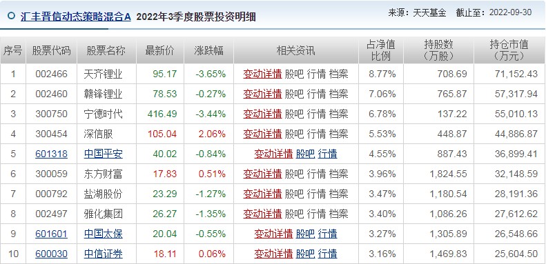 值得注意的是,相较于二季度,该基金前十大重仓股成分均未发生变化,分别为天齐锂业、赣锋锂业、宁德时代、深信服、中国平安、东方财富、盐湖股份、雅化集团、中国太保、中信证券,这些股票仅份额有所变动。三季度,该基金增持赣锋锂业、深信服,减持天齐锂业、东方财富、盐湖股份。