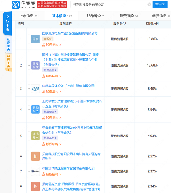 图:拓荆科技股权结构图,国家集成电路产业投资基金是第一大股东。来源:企查查