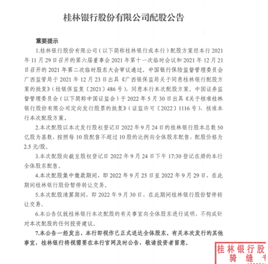 2021年12月23日,广西银保监局出具《广西银保监局关于同意桂林银行配股方案的批复》,同意桂林银行配股方案;2022年5月30日,中国证监会出具《关于核准桂林银行股份有限公司定向发行股票的批复》,对桂林银行配股方案予以核准。