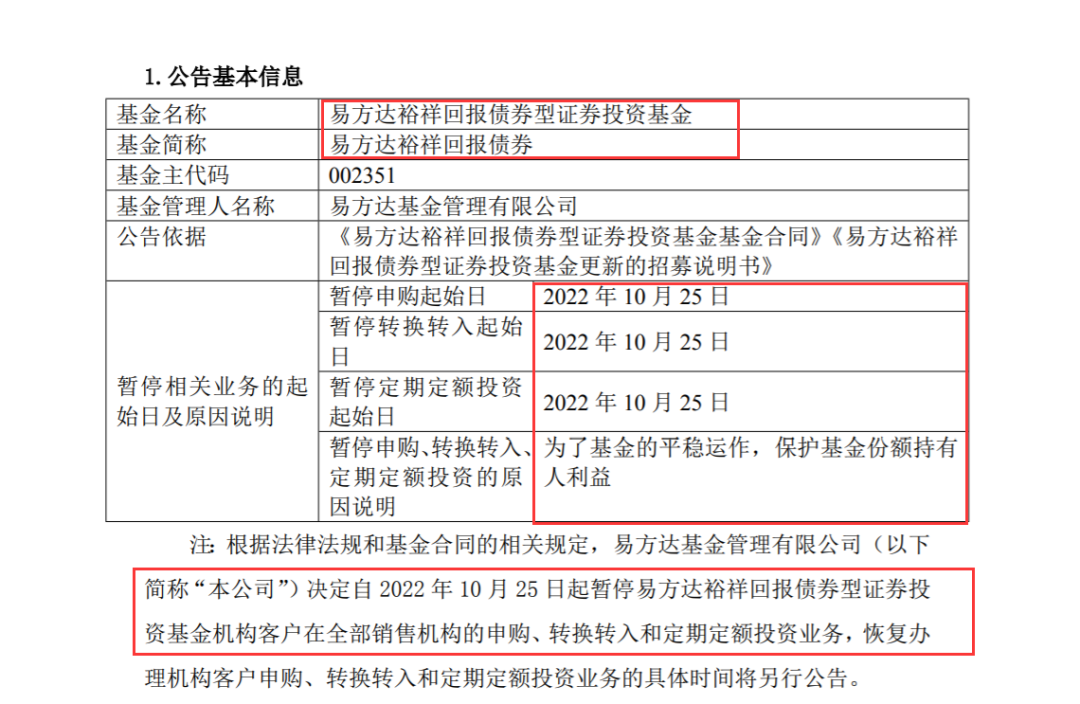 根据易方达基金24日晚间公告,10月25日起易方达裕祥回报债基将暂停机构客户的申购、转换转入及定期定额投资业务。易方达裕祥回报债基成立于2016年1月,截至2022年6月末的规模超过350亿元,截至目前成立以来的回报率接近70%,张清华、林森等基金经理均管理过该基金。截至今年上半年,该基金共有11.45万户持有人,其中机构投资者持有179.48亿份,占比87.84%。