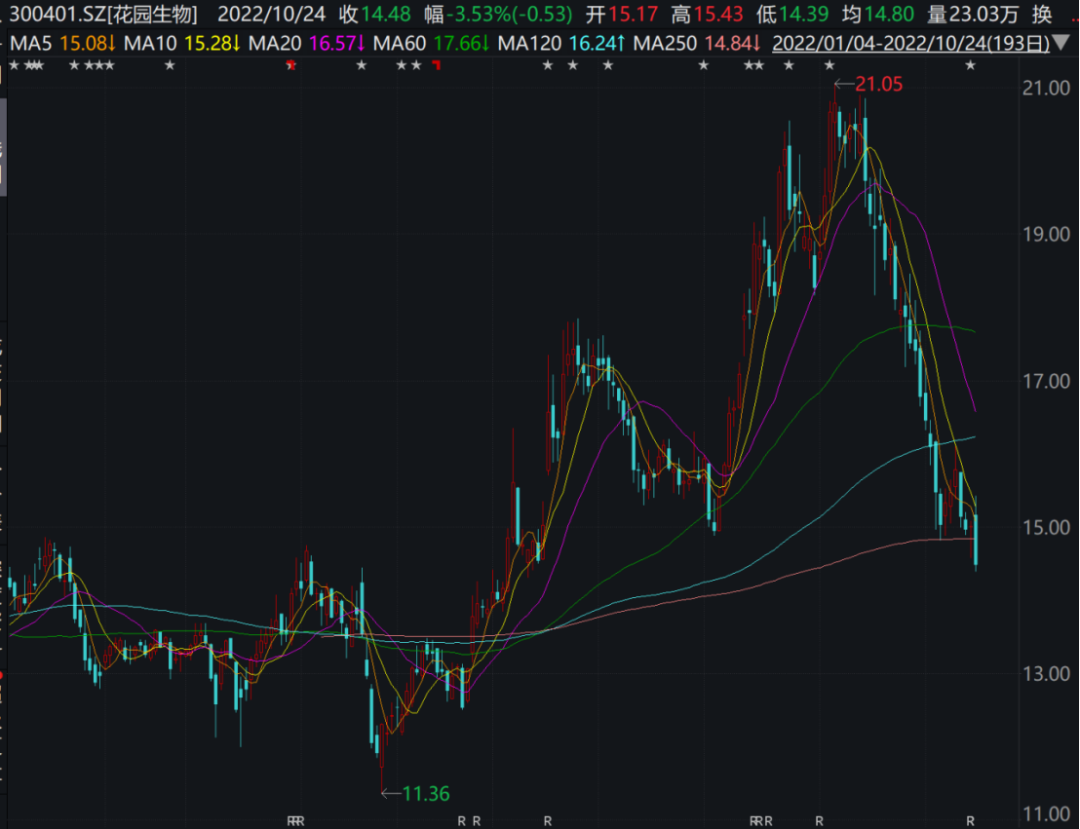 从股价表现来看,花园生物今年4月末到9月初出现一波明显上涨,从11.36元/股的位置涨至21.05元/股,但近期却出现大幅回调,截止最新收盘,报14.48元/股,总市值为80亿元。今年整体微涨2.17%。