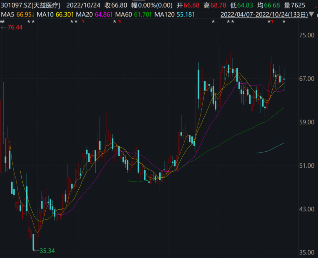 天益医疗在今年4月7日上市,发行价为52.37元/股,刚刚上市的时候盘中一度也涨至76元上方,但是随后一度跌至35.34元/股,从4月末以后反弹,走势震荡向上,到10月24日收盘,涨至66.80元/股,最新总市值仅为39亿元。