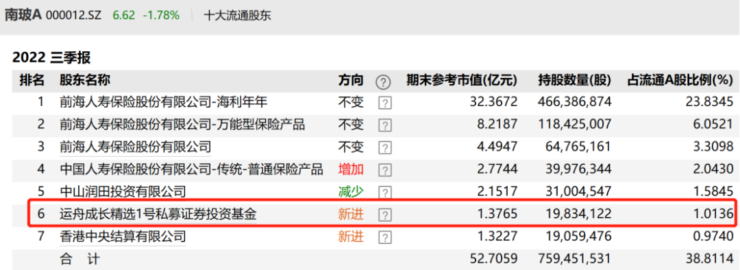 南玻A在10月24日晚间披露的三季报显示,运舟资本投资总监周应波管理的运舟成长精选1号私募证券投资基金,在今年三季度新进该股前十大流通股东榜单,持有1983.41万股,占流通A股比例的1.01%,期末持股市值达到1.38亿元,位列第六大流通股东。增持南玻A的还有香港中央结算有限公司(北向资金)等。