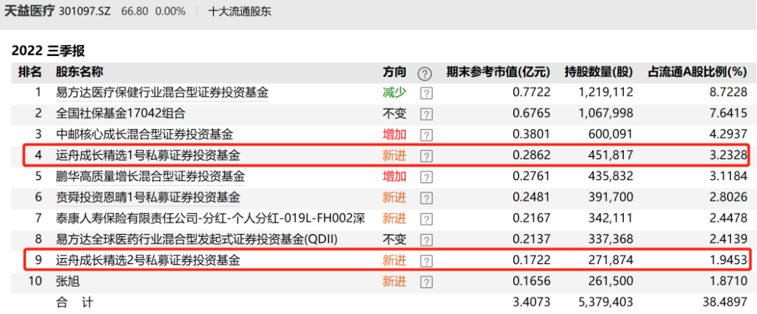 天益医疗则是在今年4月刚刚登陆创业板的,公司三季报显示,周应波管理的运舟成长精选1号、运舟成长精选2号两只私募产品,双双新进该股前十大流通股东名单,合计持有72.37万股,期末合计持股市值仅为4584万元。同时加仓天益医疗的还有中邮核心成长、鹏华高质量增长等基金,但是易方达医疗保健行业混合基金略微减持。
