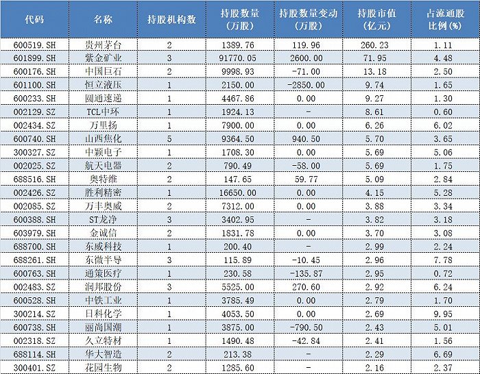 具体来看,贵州茅台(600519.SH)以高达260.23亿元的持仓市值稳居榜首,早已经成了该股前十大流通股东中“常客”的两只私募产品“金汇荣盛三号”和“瑞丰汇邦三号”三季度均不约而同地选择了继续增持该股,增持数量分别为108.63万股和11.33万股,截至三季度末,上述两只产品持仓贵州茅台的数量分别为748.76万股和641万股。