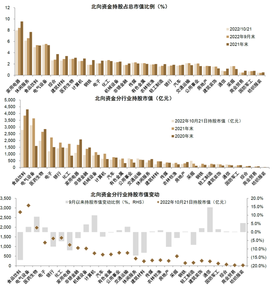 近期外资波动背后的影响因素较为综合,近期政策信号较为积极。我们认为近期外资波动的原因可能较为综合,外部环境方面,美联储加息的紧缩预期进一步强化,海外流动性环境整体偏紧,同时国际地缘环境依然复杂,中美关系波折前行,对海外投资者风险偏好也或带来一定影响;内部来看,国内三季度经济增长相比二季度初步改善,但消费、地产数据仍偏弱,增长尚待进一步企稳。需求偏弱对消费股的影响结合近期A股上市公司三季报的集中披露,可能也是外资近期对相关板块尤其是消费类企业持仓出现短期调整的原因之一。不过近期相关政策信号相对积极,近日发改委等六部门印发《关于以制造业为重点促进外资扩增量稳存量提质量的若干政策措施》、央行和外汇局决定将企业和金融机构的跨境融资宏观审慎调节参数上调,等等,在此背景下我们认为虽不排除短期波动,但类似前期的外资大幅净流出现象可能已经告一段落。