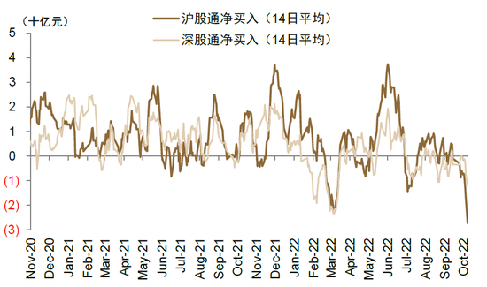 近期A股市场外资流出幅度加大,年初至今北向资金净流入规模明显收窄。近期包括北向资金在内的海外资金流向引发市场较高关注。9月以来[4]北向交易开通的32个交易日中有25个交易日呈现单日净流出,总计净流出规模647亿元。10月24日北向单日净流出179亿元,单日净卖出额创历史新高。截至10月25日,年初至今北向资金净流入规模缩窄至15亿元(其中沪股通年初至今净流入506亿元,深港通净流出491亿元),相较过去5年年均近3000亿元的净流入规模明显缩窄。作为另一参考的EPFR资金流向数据也显示A股市场今年下半年以来海外主动资金净流出,9月以来海外主动资金累计净流出11.7亿美元。
