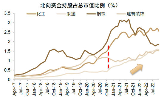 图表13:近年来北向资金持股在化工、采掘、建筑板块中的占比逐渐提升