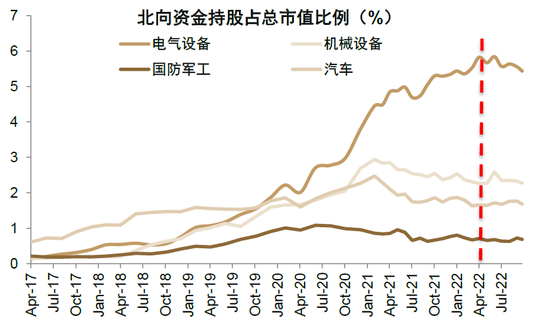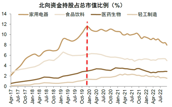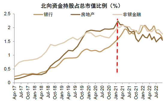 图表12:地产、金融板块中,北向资金的持股占比从2021年开始也不再增加,地产板块下降较多