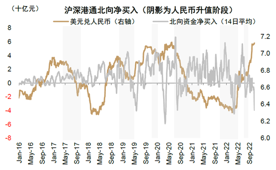 图表8:近期人民币贬值速度较快、幅度较大,可能是导致北向资金流出的因素之一
