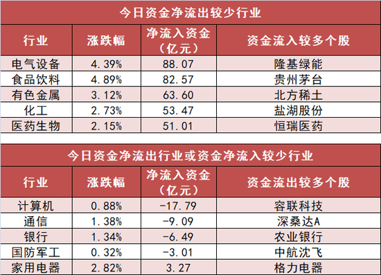 申万一级行业中,24个行业实现资金净流入,其中电气设备行业净流入88.07亿元居首。