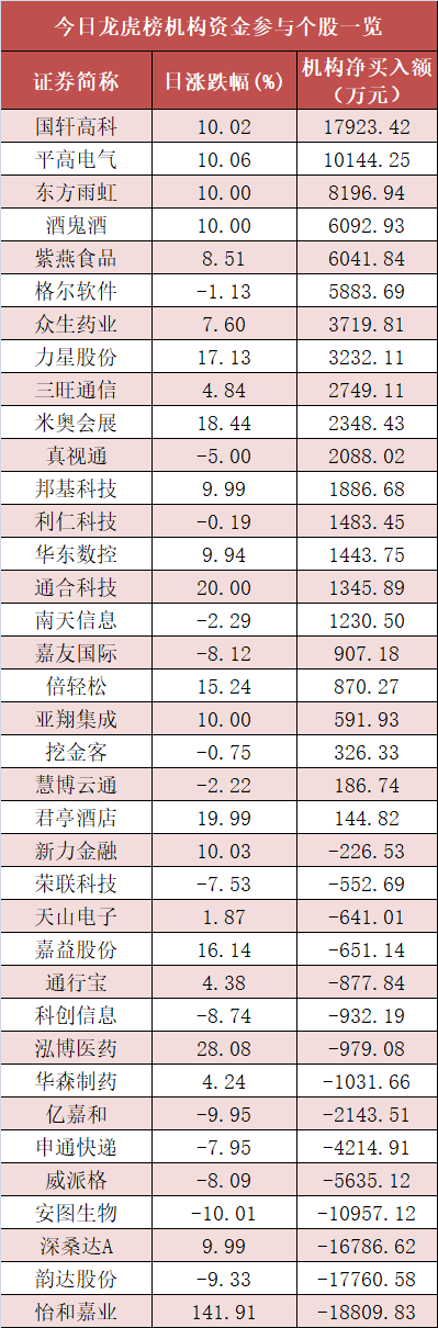 盘后龙虎榜数据显示,机构现身37股,其中国轩高科等22股现机构资金净买入,怡和嘉业等15股呈现机构资金净卖出。