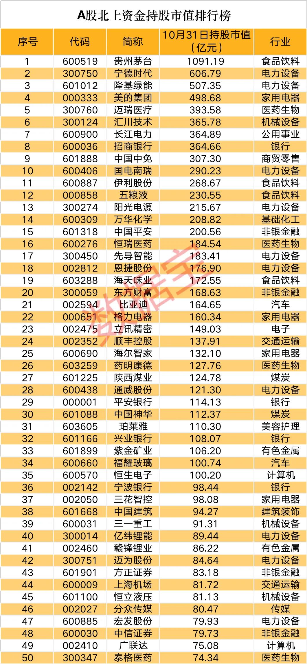 数据宝以10月31日北上资金持股数量为基准,发布《A股北上资金持股市值排行榜》。数据显示,50强持股市值为9948.59亿元,超过全部持股市值的一半。贵州茅台、宁德时代稳居前二名,持仓变动方向则相反,贵州茅台遭减持990.1万股,宁德时代则获得291.4万股的加仓。
