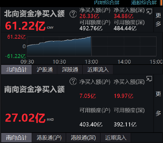 截至沪深股市收盘,北向资金净流入61.22亿元,其中,沪股通净流入26.33亿元,深股通净流入34.88亿元。
