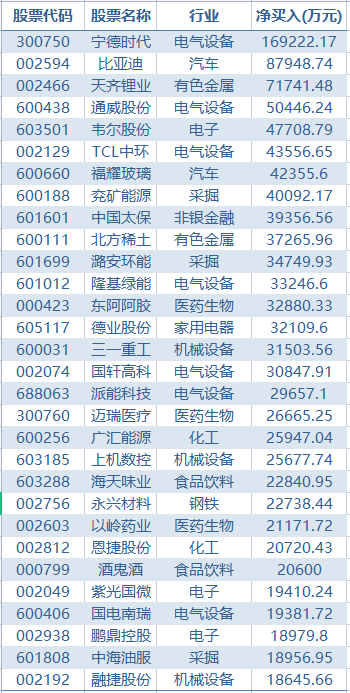新能源车头部公司本周获得北上资金重点关注,净买入前3位,均为新能源车产业链公司,分别为宁德时代、比亚迪、天齐锂业,净买入16.92亿元、8.79亿元、7.17亿元。