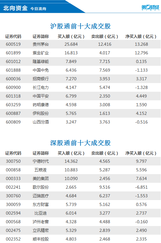 前十大成交股中,净买入额居前三的是贵州茅台、紫金矿业、宁德时代,分别净买入13.27亿元、12.8亿元、9.8亿元。