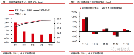 上周债市在防疫政策优化、宽地产支持政策发力、资金面偏紧的影响下全面走熊,周内调整呈现大起大落的状态。上周一,在防疫政策优化、宽地产支持政策发力、资金面偏紧的三重利空冲击下,债市迎来年内最大单日跌幅,长债利率收于2.84%;在投资者情绪尚未完全修正时,周三的债基赎回潮触发债市二次调整,短端利率调整显著大于长端,同业存单当天收益率上行逼近20bps。虽然央行增大逆回购投放,但债市驱动仍偏向于情绪面,悲观预期下,上周五10年期国债到期收益率收于2.83%,全周累计上行9bps。