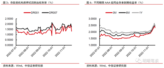 资金面波动加大,流动性整体趋紧,同业存单利率上行明显。10月以来,资金面边际收敛,DR007的运行中枢从1.5%逐步上行至1.8%附近,个别时点甚至触及2.0%,与7天逆回购利率持平;同业存单到期收益率也不断上行,直到11月16日当天由于部分债基和理财产品面临较大的赎回压力,不得不被动抛售部分资产,流动性较好的同业存单受到的冲击更大,1年期AAA级同业存单收益率调整的幅度近20bps,达到2.65%。此后在央行的调控下,利率虽然有所回落,但依然处于年内高位。