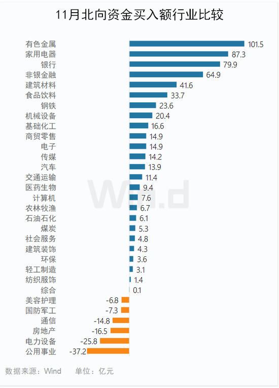 从陆股通行业资金流向变动情况来看,11月以来,北上资金加仓了25个行业,减仓6个行业。其中,金融(银行、非银金融)、有色金属、家用电器三大行业买入额位居前三,净买入金额分别为144.78亿元、101.55亿元、87.3亿元。