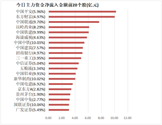 4、中国平安主力资金净流入10.22亿元居首