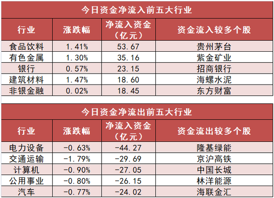 【9日资金路线图】两市全天资金净流出50亿元 食品饮料板块资金净流入居前