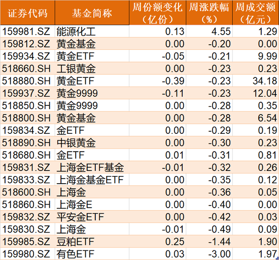 商品ETF本周涨跌互现,能源化工大涨4.55%,而有色ETF、豆粕ETF则分别下跌了3%、1.44%,另外黄金相关ETF普跌约0.3%。