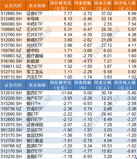 在行业主题ETF方面,本周份额增长超过1亿份的有13只基金,其中证券ETF、半导体和中药ETF份额分别增加了7.77亿份、6.1亿份和5.82亿份。