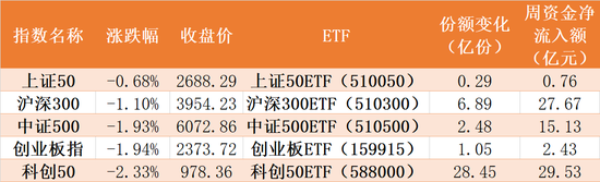整体看来,本周市场各大指数出现调整,场外资金却在进场扫货,5只指数ETF本周合计净流入约75亿元,其中科创50ETF、沪深300ETF分别净流入30亿元和28亿元。