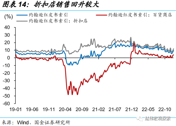 美国红皮书零售销售指数小幅反弹。当周增速9.6%,高于前值7.6%,连续第三周同比增速回升。结构上,折扣店销售回升较大。折扣店增速11.9%,前值9.4%;百货商店增速4%,前值3.2%。全年看,美国零售总体震荡下行趋势不变。全年零售增速高点为2月的18%,11月降至6.5%。