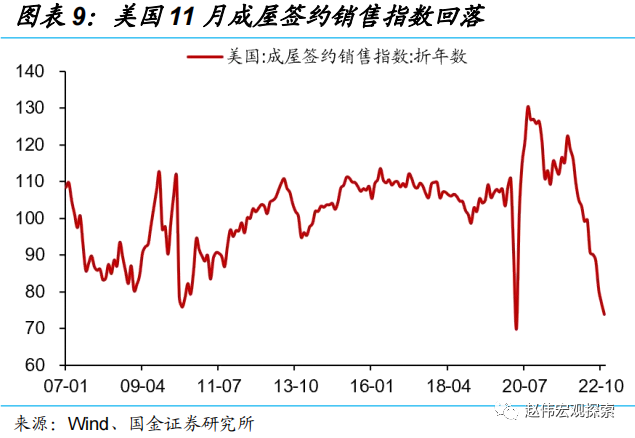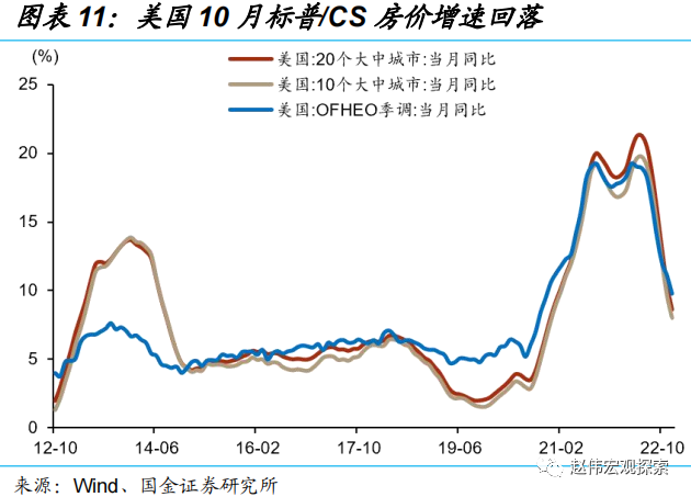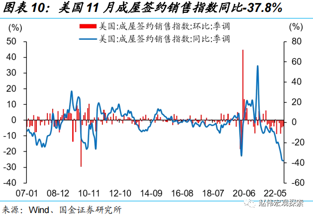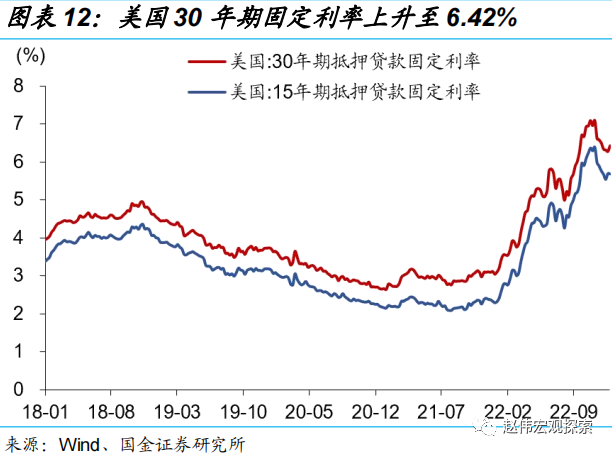 美国地产延续下滑趋势。11月成屋签约销售指数同比-37.8%,环比为-4%,为连续第六个月下滑。美国11月10城标普/CS房价指数同比8%,低于9月的9.6%。20个城房价指数同比上涨8.6%,低于9月的10.4%。美国30年期固定利率房贷的平均利率从上周的6.27%上升至6.42%,去年同期为3.11%。