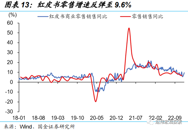 美国地产延续回落。11月成屋签约销售指数同比-37.8%,环比为-4%,环比为连续第六个月下滑。美国10城及20城房价指数同比继续回落。30年期固定利率房贷的平均利率从上周的6.27%上升至6.42%。本周美国红皮书零售销售指数小幅反弹,当周9.6%,高于前值7.6%,为连续第三周同比增速回升。